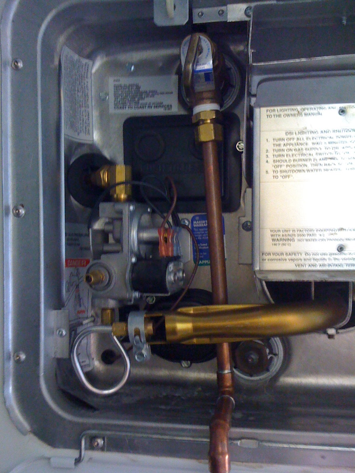 Well in this heater there is a safety/expansion valve - but no place for the water to go - it just leaks through the joins and into the cabin somewhere!! So of course that's another thing that needs fixing - a bit of copper pipe (the water is HOT) with a couple of bends soldered in and a slot cut in the cover